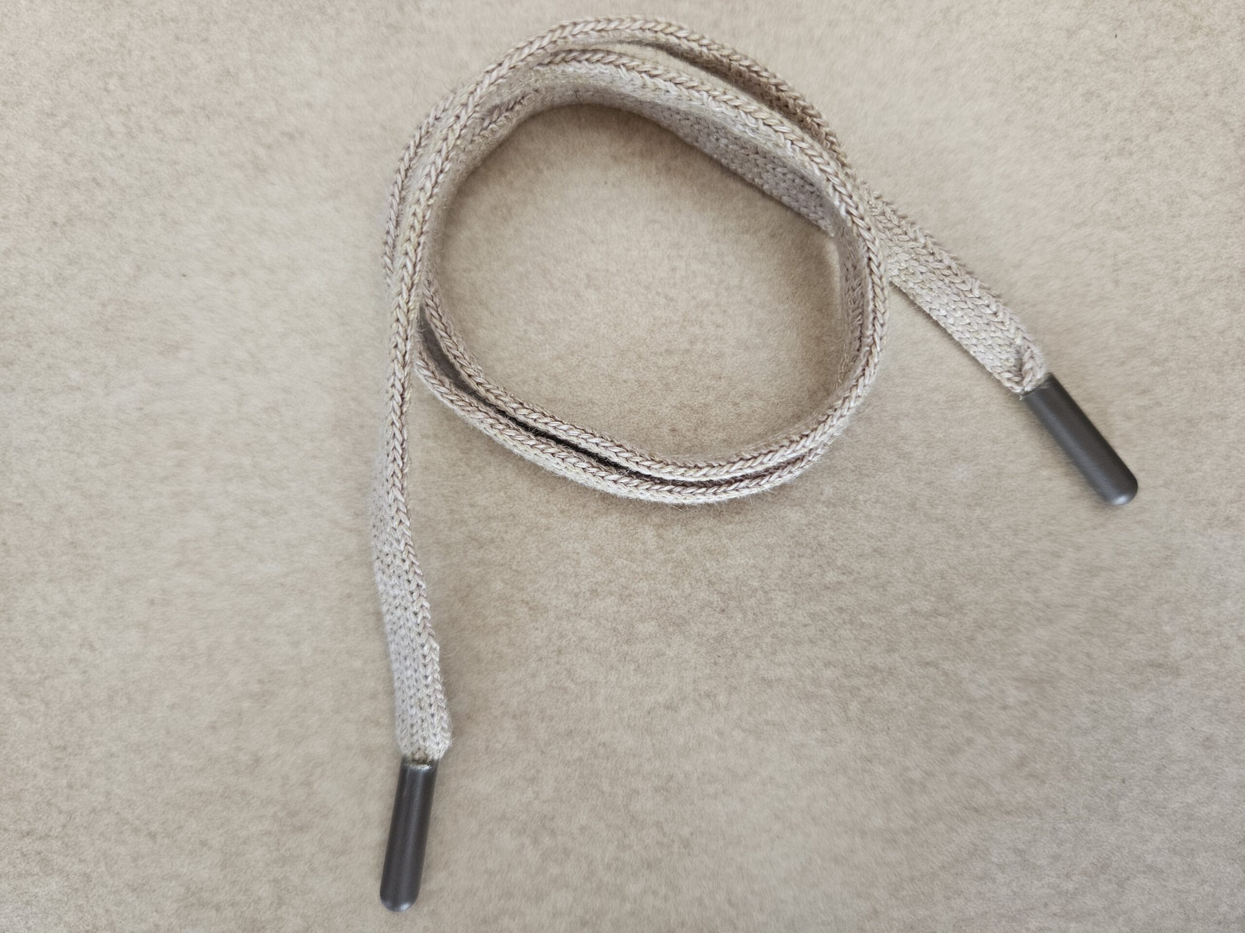 Es un cordón delgado para zapatos planos (0,7 cm de ancho). El tejido está confeccionado siguiendo la técnica del jersey con puntos estrechos.